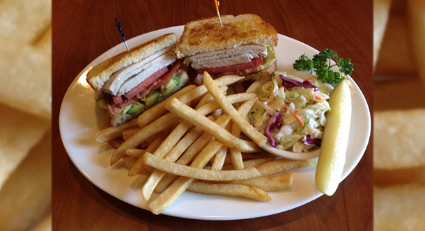 Clubhouse SandwichTriple Decker with Breast of Turkey, Crispy Bacon, Lettuce and ripe Tomatoes, served with French Fries.